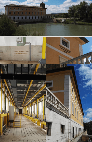 La presa de Pignatelli, en el río Ebro, deriva aguas a través de la Casa de Compuertas., con imágenes interiores y marcas de las inundaciones históricas del Río Ebro.