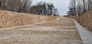 En las partes basales de los muros, de las rampas del Puente, aparecen en la mampostería de bloques, grandes carretales de un material completamente diferente. Son unas calizas con gran cantidad de fósiles en las que pueden reconocerse restos de algas y gasterópodos.